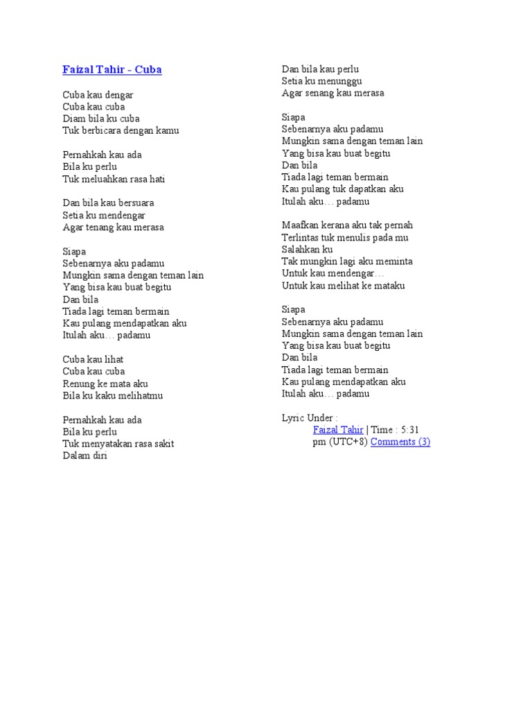Faizal Tahir Cuba Dan Bila Kau Perlu - Download lagu aku harus bagaimana 1.48mb dan streaming kumpulan lagu aku harus bagaimana 1.48mb mp3 terbaru di metrolagu dan nikmati hasil diatas adalah hasil pencarian dari anda aku harus bagaimana mp3 dan menurut kami yang paling cocok adalah aku harus bagaimana.