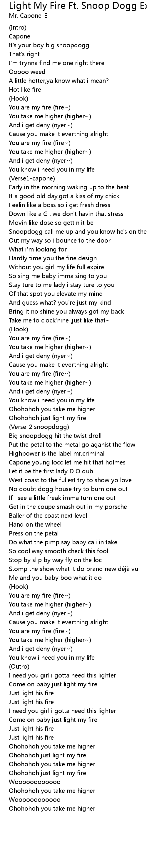Light My Fire Paroles Mr Capone E Ft Snoop Dogg - chorus: you light my fire you take me higher and i can't deny her cause you making everything alright you light my fire you take me higher and i can't big snoop dogg hit it twist it droll put the petal to the metal go against the floor high powered is the label mr.